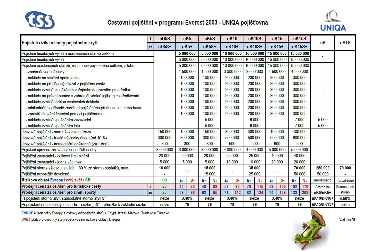 - komplexní pojištění K10S zahrnující i pojištění úrazové, proti stornu zájezdu (s limitem storna zájezdu 35.000,-Kč) atd. dle tabulky níže za 70,- Kč/os./den
