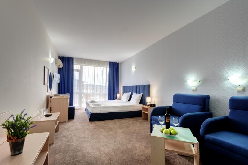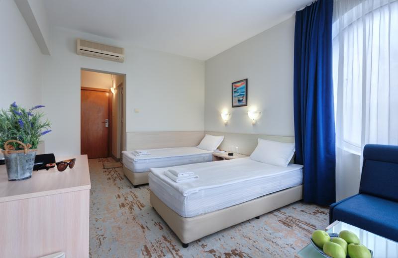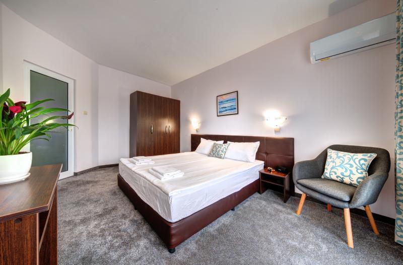 Velmi vkusně zařízené dvoulůžkové pokoje s možností až dvou přistýlek jsou vybaveny klimatizací, TV, balkónem, lednicí a vlastním sociálním zařízením (sprcha, WC, fén). K dispozici je apartmán (ložnice + obývák, maximální obsazenost 2+2 děti nebo 3 dospělé osoby), který má částečný výhled na moře a velkou terasu. V apartmánu se platí tři plné ceny za dospělou osobu. Wifi připojení na pokoji zdarma.