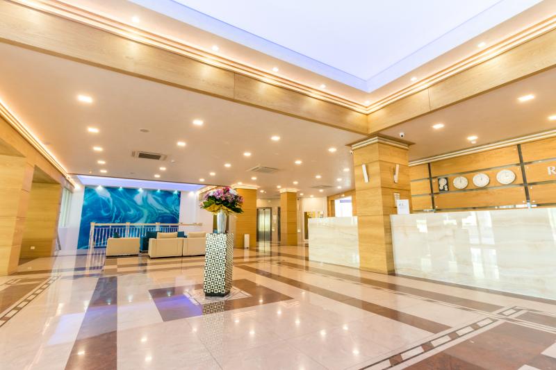 Hotel je pouze pro dospělé osoby (16+). Hotel disponuje vstupní halou s recepcí, výtahem, klimatizací, hlavní restaurací s terasou s výhledem na moře, lobby barem, venkovním a vnitřním bazénem, lehátky a slunečníky u bazénu + na pláži, WiFi v prostorách hotelu zdarma a posilovnou. Za poplatek je zde k dispozici trezor, parkování u hotelu (5 euro/den), čistírna, sauna, parní lázeň, Turecká lázeň a vodní sporty. Dále se zde nachází mini market a směnárna. Bankomat se nachází asi 300 metrů od hotelu.